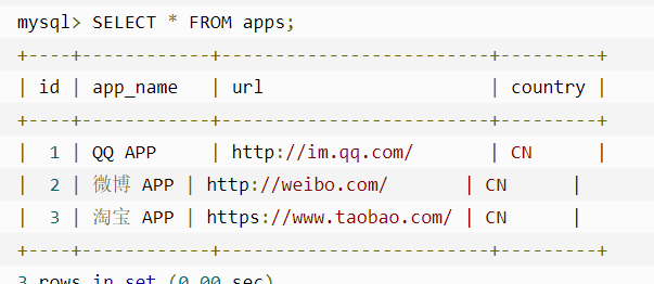 两张原始数据表websites、apps。从两张表中选取不同的country