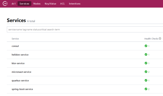 java -jar helidon-service/build/libs/helidon-service-all.jar java -jar ktor-service/build/libs/ktor-service-all.jar java -jar micronaut-service/build/libs/micronaut-service-all.jar java -jar quarkus-service/build/quarkus-service-1.0.0-runner.jar java -jar spring-boot-service/build/libs/spring-boot-service.jar 启动所有微服务后,访问 http://localhost:8500/ui/dc1/services,你将看到:
