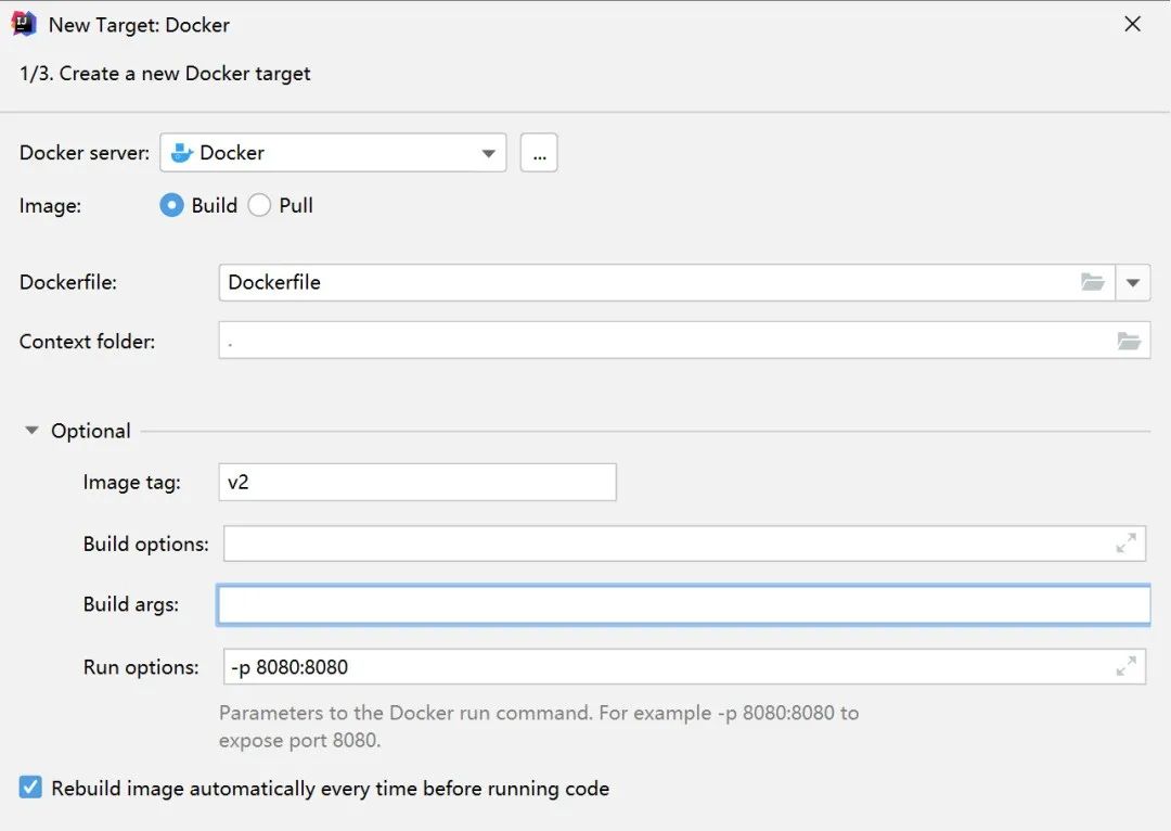 新建一个 Run Target,选择 Docker 会弹出这个界面。首先要根据下图先设置一下 Docker Server。Dockerfile 就使用上面的那个 Dockerfile 就可以了: