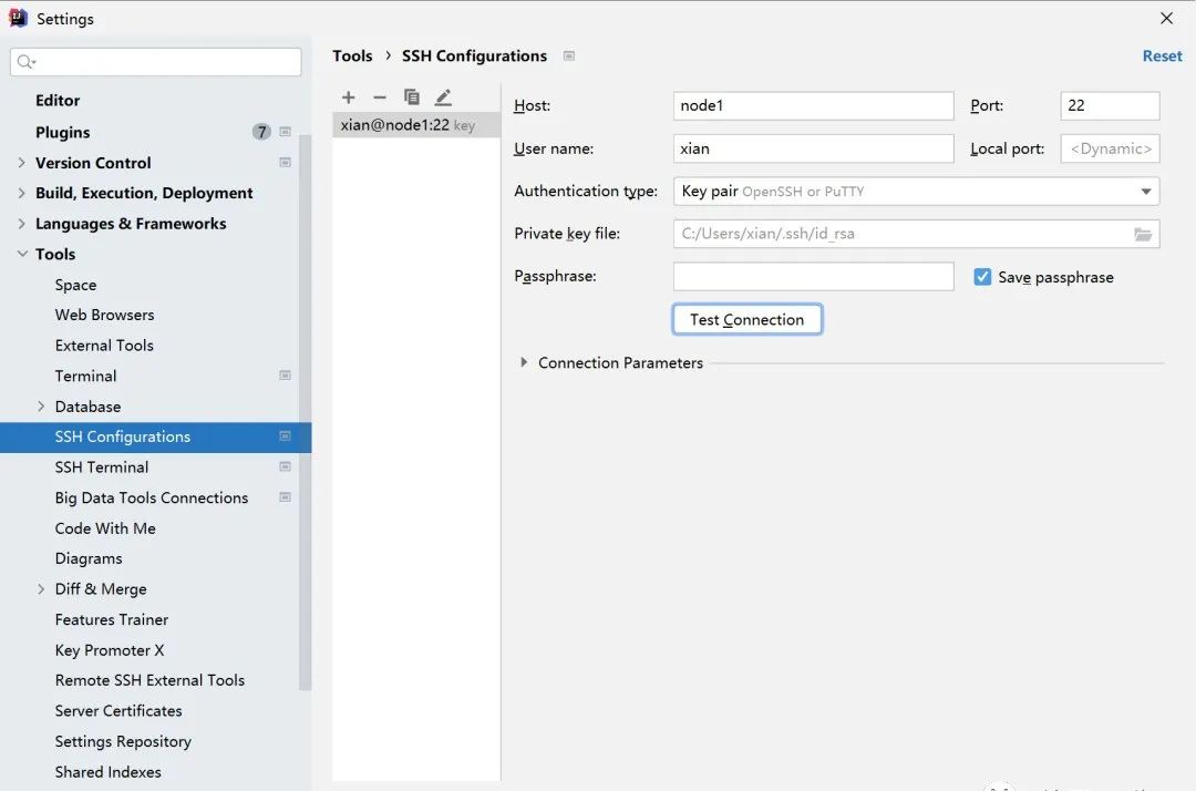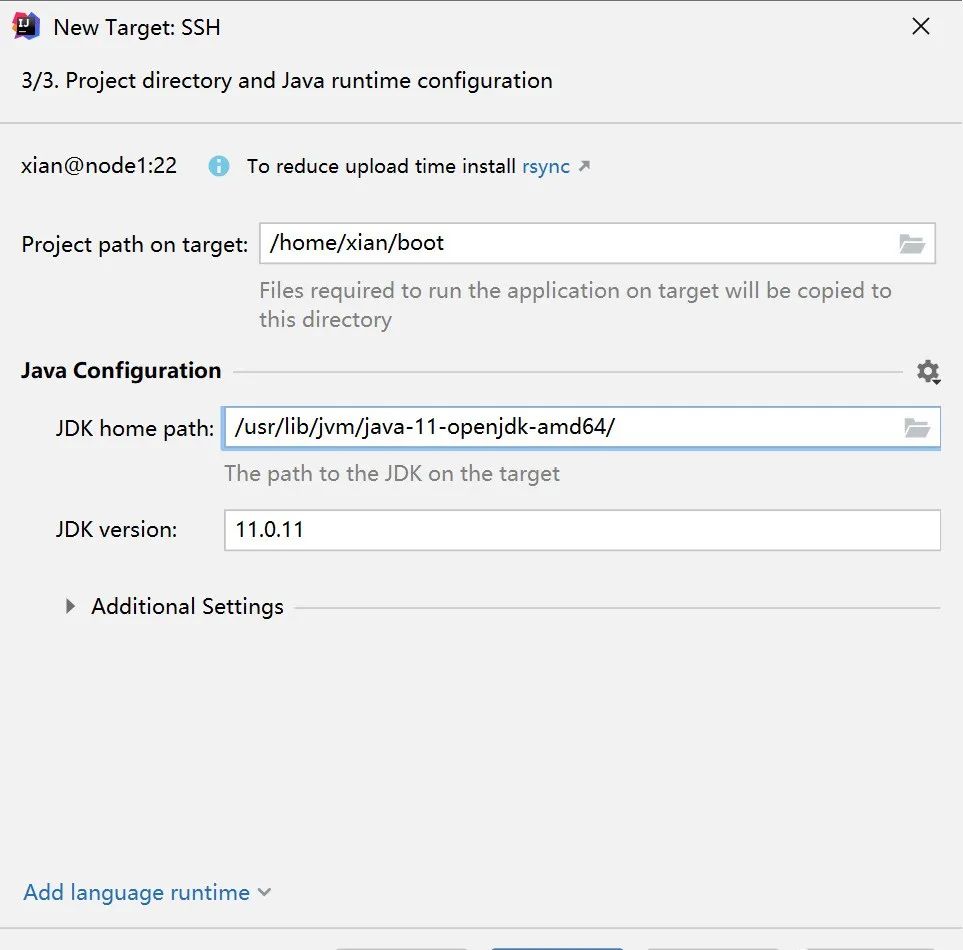 这个总体体验很不好,每次运行都要上传一堆依赖的 jar 包,不知道是不是我没有配置好 rsync 还是没有优化好。还有一个待优化的点是最好可以手动选择 SSH 还是 Password 的方式登录。而不是要像下图那样子需要先自己配置一下: