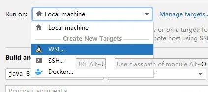 设置入口:设置 WSL、SSH、Docker 运行的入口在 Run/Debug Configuration 里,默认是 Local machine 跟以前的本地运行一样。