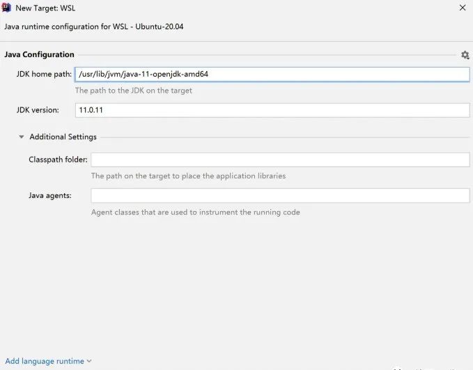 首先需要在 WSL 里安装 JDK 和设置一下 JAVA_HOME,设置入口见上面,新建 WSL 的 Run On 环境,选择好你的 WSL 发行版,如果出现绿色的 successfully 表示可以使用这个 WSL。