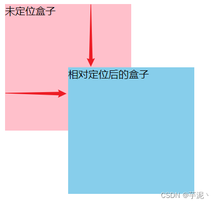 如下图,盒子未定位时处于粉色盒子的位置,当给盒子添加相对定位后,盒子是根据粉色粉色盒子的位置来移动的,即自己原来的位置。