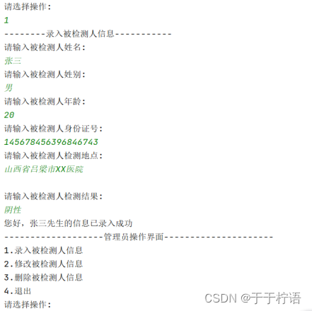 该系统为核酸检测结果查询系统,由java实现,用到了面向对象,java基础语法等知识,有一个主方法和8个对应的功能方法,建了一个People类用于生成对象,存放数据,主界面有两个入口,一个为普通用户查询入口,用户可以通过输入身份证号来查询核酸报告结果,第二个入口为工作人员(管理员)入口,工作人员可以凭借管理员账号和密码进入管理员界面来进行操作,主要用于录入被检测人的信息和核酸检测结果,修改,删除等操作,管理人员录入信息之后,普通用户才可从第一个入口查到自己的结果。