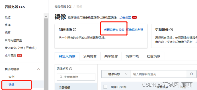 首先登陆阿里云账号--控制台--云服务器ECS--实例 在实例页面点击左侧--镜像--创建自定义镜像