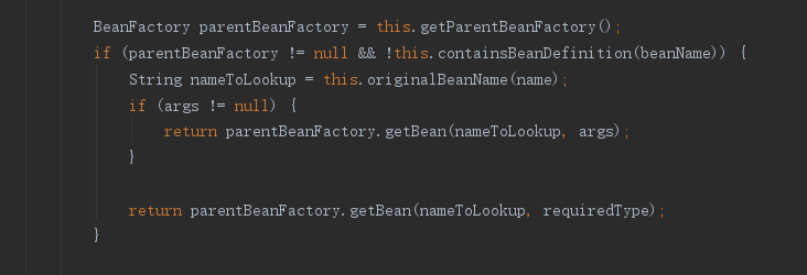 我认为前者比较好理解,若ParentBeanFactory不为空且beanDefinitionMap中没有这个bean,则调用 ParentBeanFactory的getbean()方法。