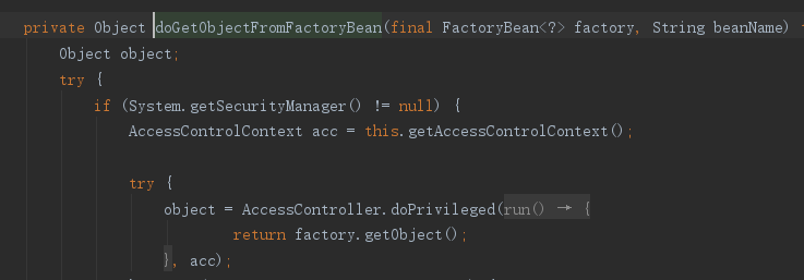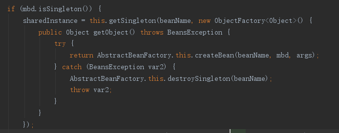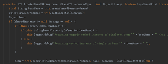 doGetBean方法开始会调用getsingleton()方法尝试获取bean实例,如果该bean实例为空,则继续执行下面的代码。如果bean实例不为空,则调用getObjectForBeanInstance()方法。获取Bean 实例。
