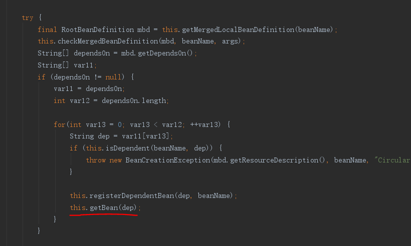 接下来的getbean()方法用于解决当前bean所依赖的其他bean的实例化。