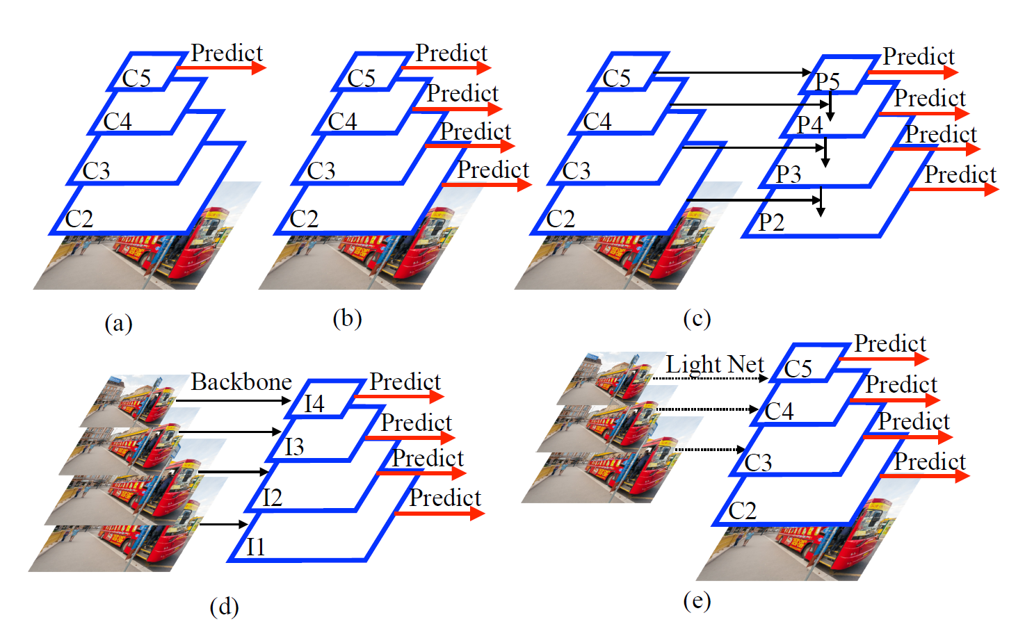 尺度不平衡就是检测目标的大小具有多样性。解决尺度不平衡问题也就是解决如何有效检测出多尺度目标。主要方案有三种,基于图像金字塔的方法(d),基于特征金字塔的方法(c),以及基于图像和特征金字塔的混合方法 (e)。