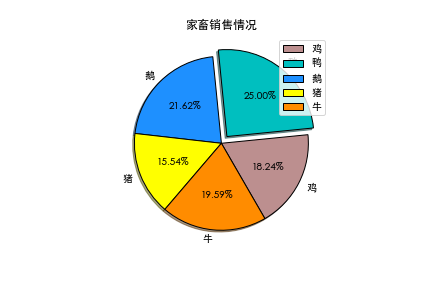 plt.pie(x,autopct="%.2f%%",shadow=True,wedgeprops={"edgecolor":"black"},colors=["rosybrown","c","dodgerblue","yellow","darkorange"],labels=["鸡","鸭","鹅","猪","牛"],explode=explode,startangle=-60)