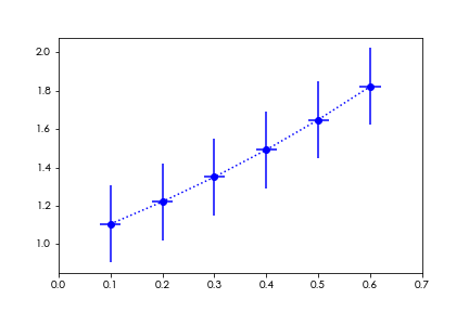 plt.errorbar(x,y,fmt="bo:",yerr=0.2,xerr=0.01)