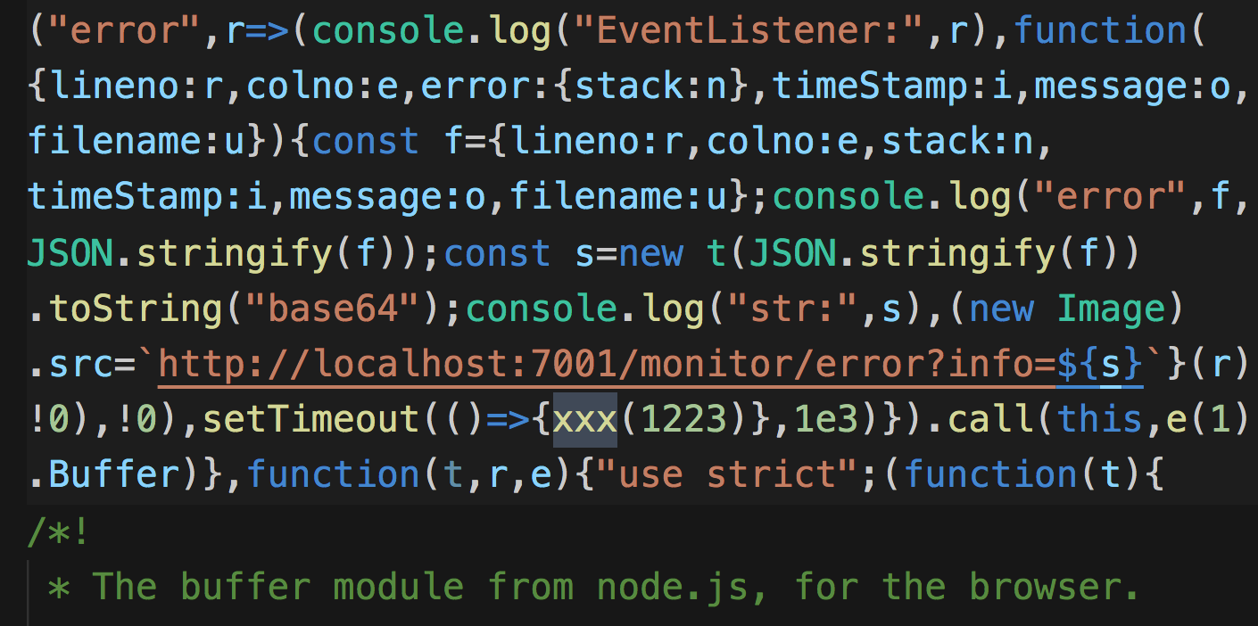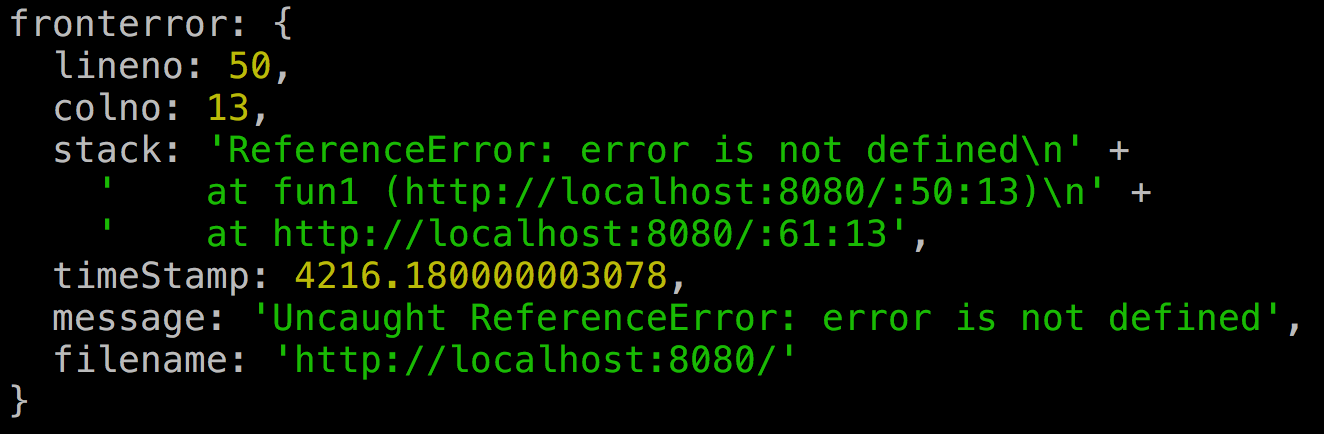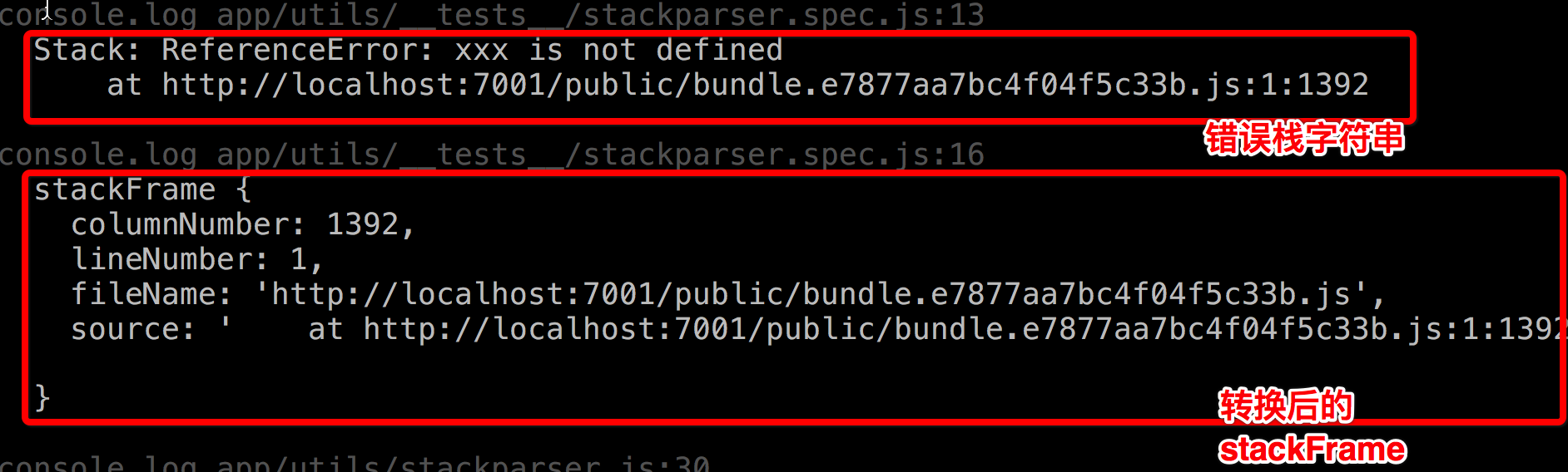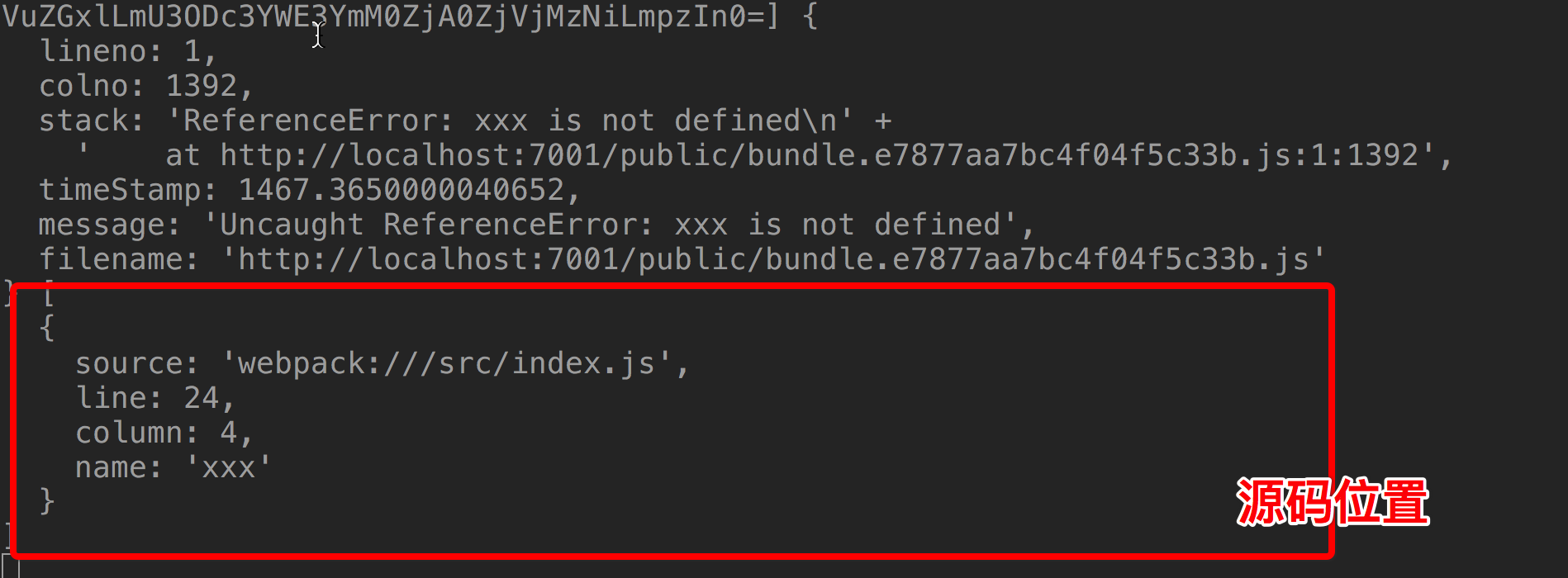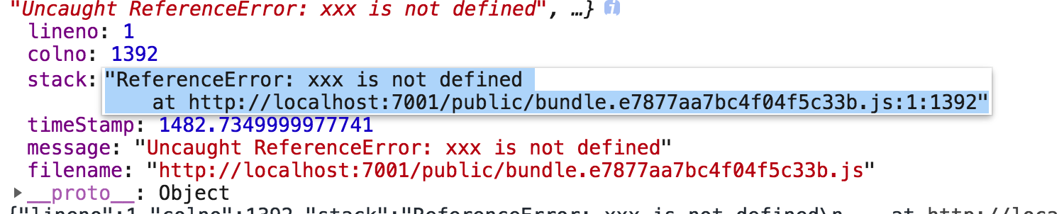 | 输入 | stack(错误栈) | ReferenceError: xxx is not defined\n' + ' at http://localhost:7001/public/bundle.e7877aa7bc4f04f5c33b.js:1:1392' |