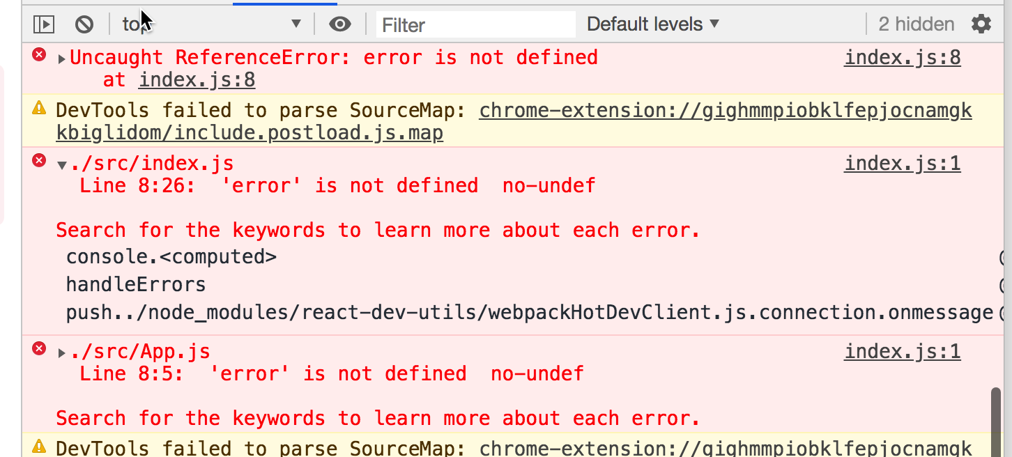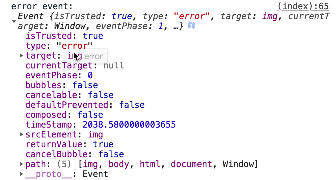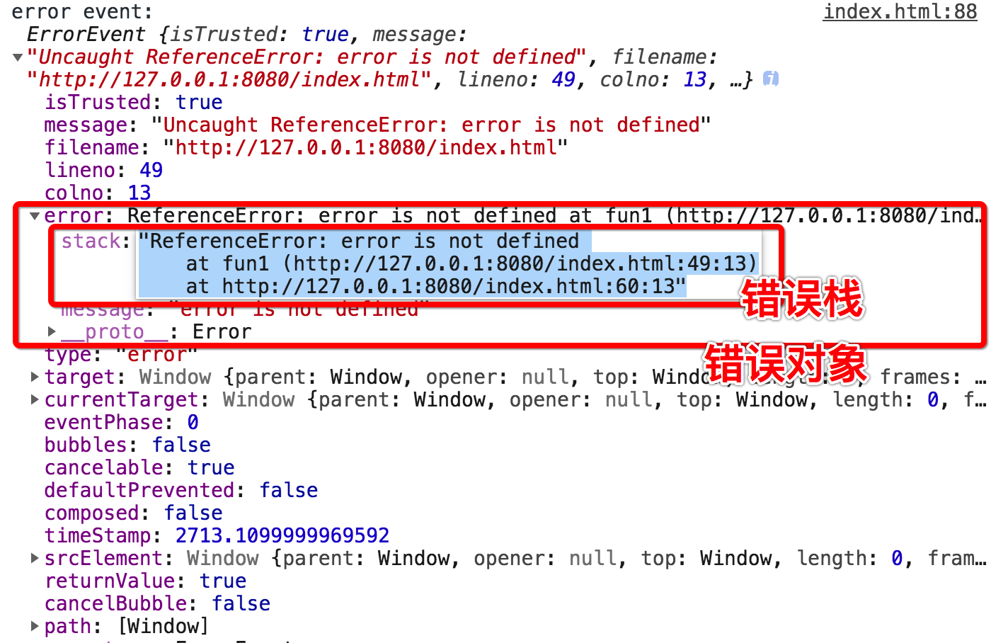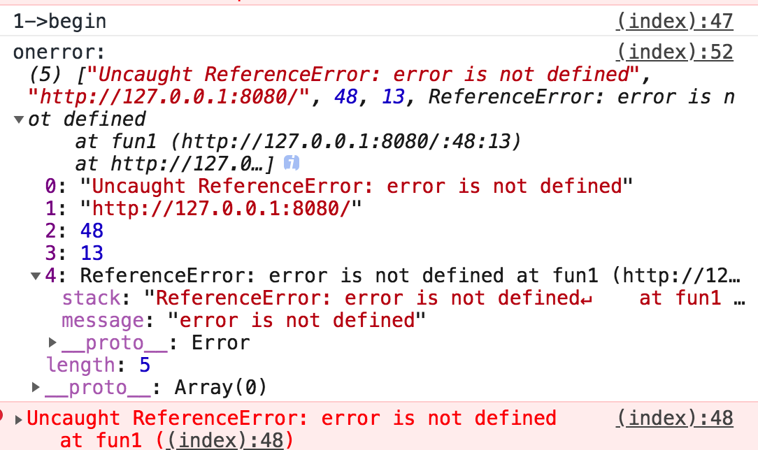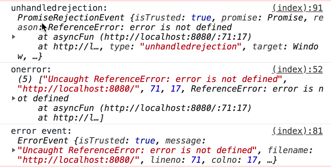 onerror还有一个问题大家要注意 如果返回返回true 就不会被上抛了。不然控制台中还会看到错误日志。