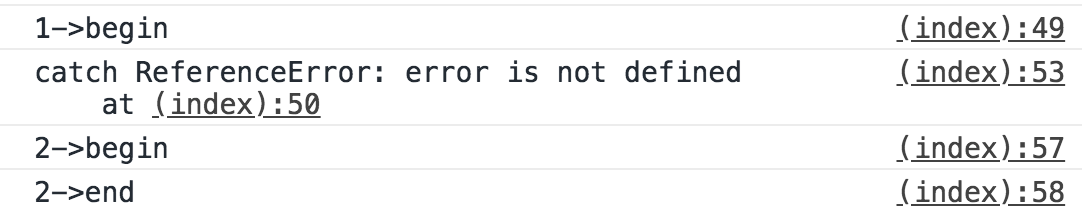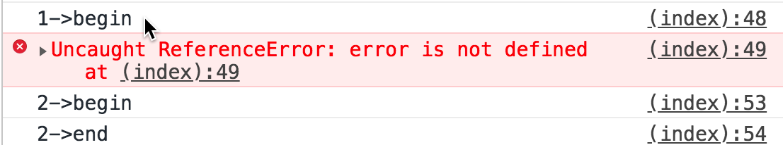 上面的例子我们用setTimeout分别启动了两个任务,虽然第一个任务执行了一个错误的方法。程序执行停止了。但是另外一个任务并没有收到影响。