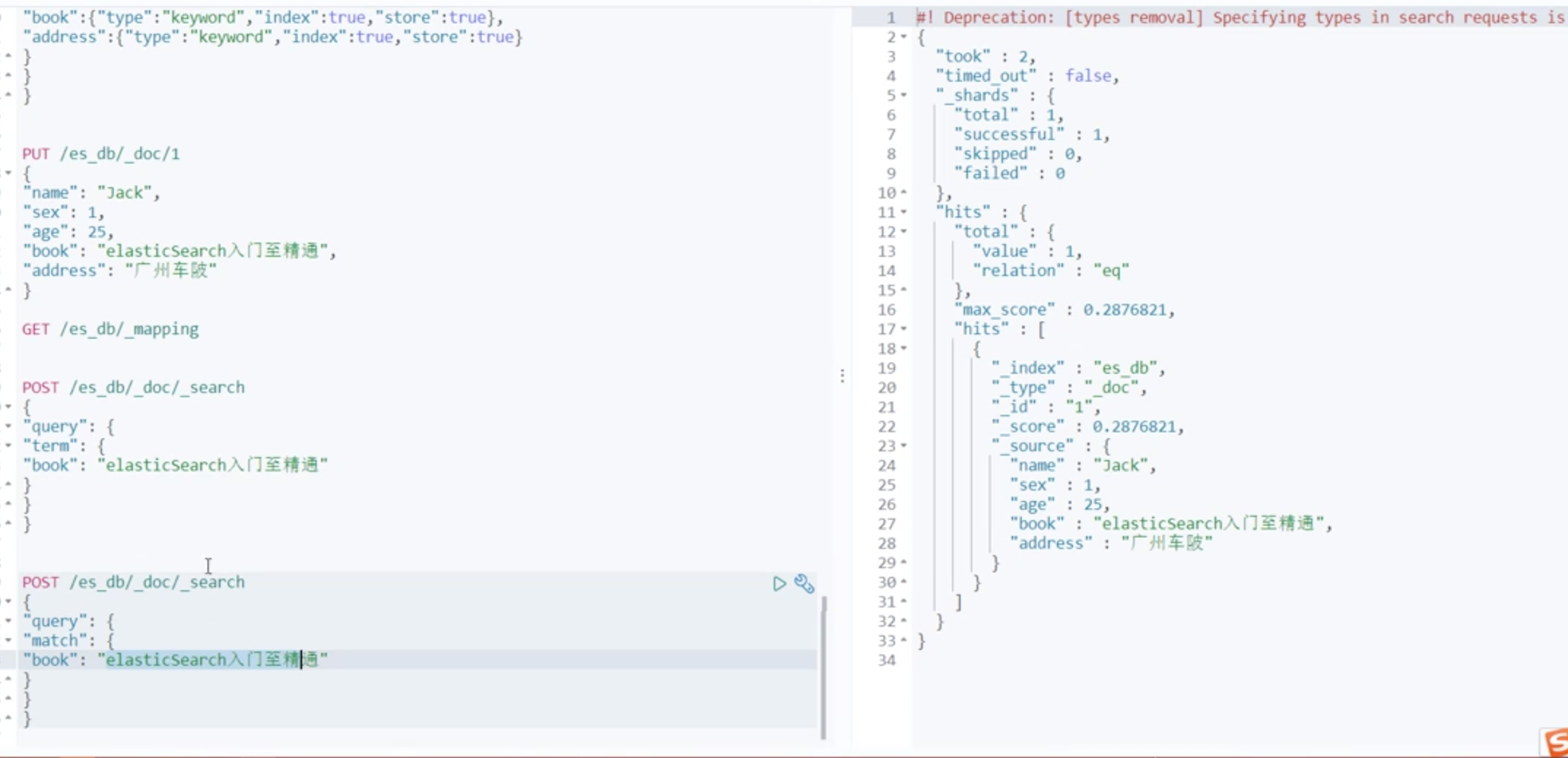 解答:使用match查询keyword类型的字段时,因为keyword类型的字段在存入时就不会分词,所以如果使用match查询内容的话,那么被搜索的内容肯定会分词,一旦分词就不会匹配到keyword类型字段的内容,如果match的整体内容和keyword的索引全匹配也会被搜到。如图中keywork类型的字段book中的内容为“elastic...”,而match中的内容也是“elastic...”,则就会被搜到。如果match内容为“elastic...”中的某个词语,那肯定就不会被搜到了。