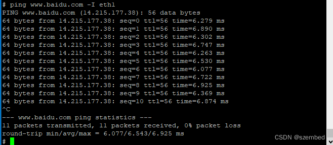 测试网口连接外网是否正常,以访问"www.baidu.com"为例,执行如下命令,"-I"代表指定网口,不加"-I"则使用默认网卡。可按"Ctrl + C"终止ping命令。
