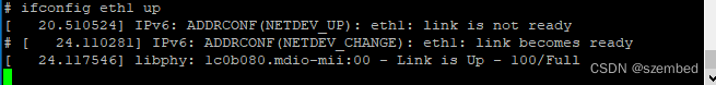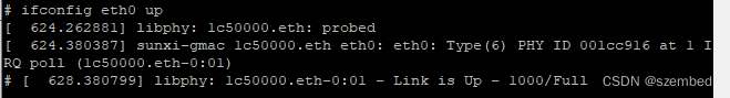 进入评估板文件系统,手动开启网络eth0,获取IP,并执行ifconfig命令查看网口配置信息。