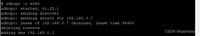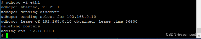 通过udhcpc 指令获取IP,"-i"用于指定网卡,eth0为网卡名字,请根据实际情况修改。不加"-i"和网卡名字,则指默认网卡eth0。