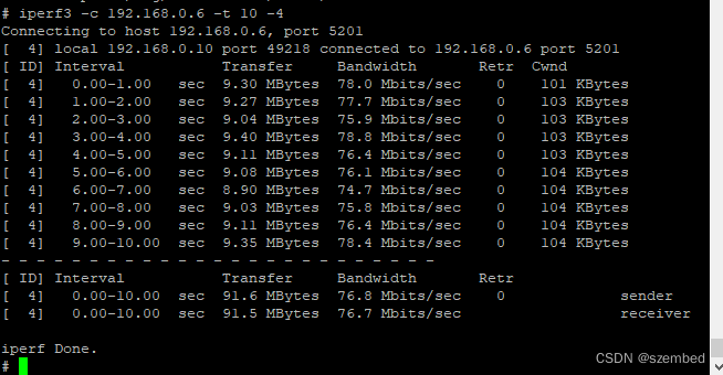 Target# iperf3 -c 192.168.0.6 -t 10 -4