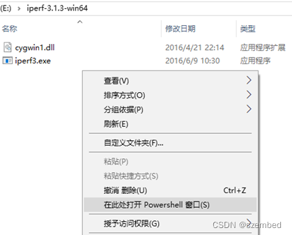 首先,要在主机端下载iperf3工具。从官网下载网址iPerf - Download iPerf3 and original iPerf pre-compiled binaries中下载跟电脑系统配套的版本。如果电脑里面已经有iperf3工具,则可直接使用。解压缩下载的文件,进入到iperf3.exe所在目录下,按住Shift键,然后单击鼠标右键,选择“在此处打开Powershell窗口”选项,打开命令行窗口。如下图所示: