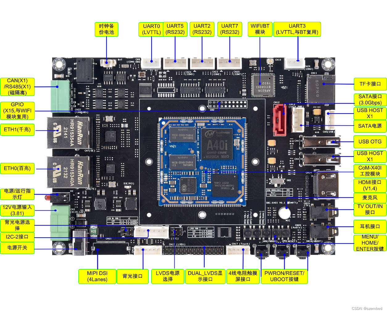 - 采用Allwinner公司Cortex-A7四核A40i处理器,运行最高速度为1.2GHZ;