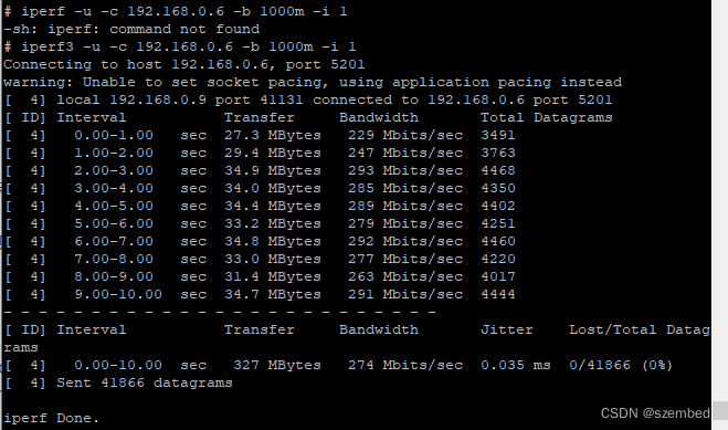 UDP带宽测试同样使用iperf3工具进行测试。执行以下指令,测试UDP带宽,本次测试主机IP为192.168.0.6: