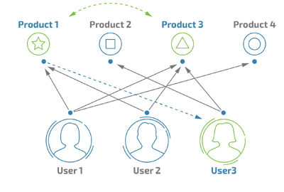 通过计算5个用户对5件商品的评分我们获得了用户间的相似度数据。这里可以看到用户A&B,C&D,C&E和D&E之间相似度较高。下一步,我们可以依照相似度对用户进行商品推荐。