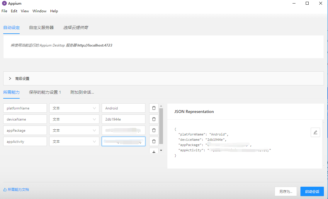 拉起会话器后,填写参数,必要的参数有platformName,deviceName,如果需要拉起对应app需要填写appPackage和appActivity参数。