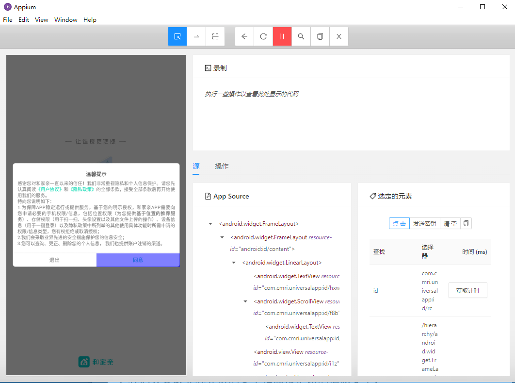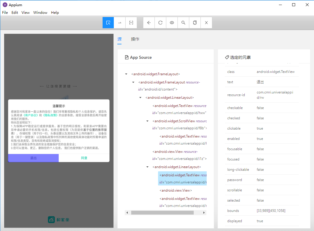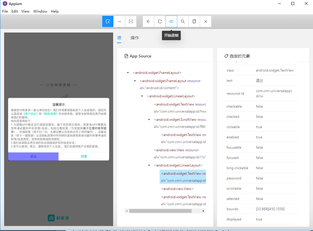 点击启动会话后,会拉起app,同时出现手机上画面的快照。在画面中点击页面中的元素,或者展开元素树,可以找到对应控件的id等属性,在编写自动化测试时,可以通过id找到对应的控件,进行操作。