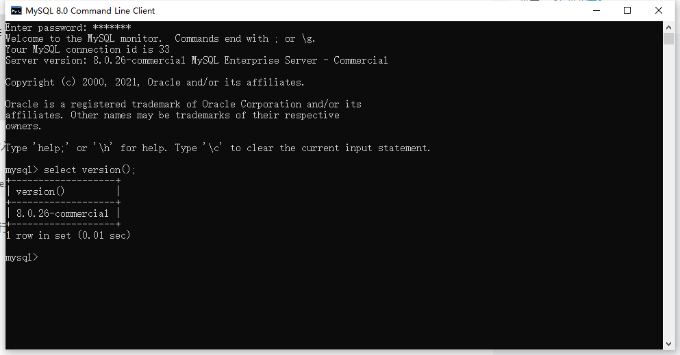 4.实际上细心的小伙伴可能已经发现,在输入password密码登陆进去后就会自动显示自己的MySQL版本了,这边也是多此一举,不过熟悉一下命令行也算受益
