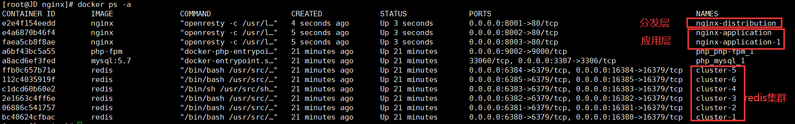 | Nginx | 172.18.0.8 | 8001->80 | Nginx分发层 |