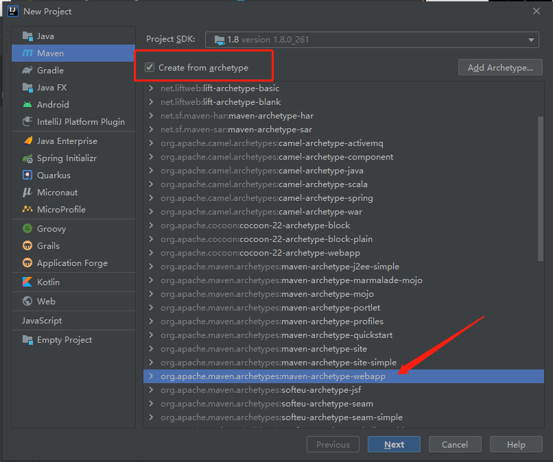 2.选择MAVEN,点击Creat from archetype,选中maven-archetype-webapp ,点击next