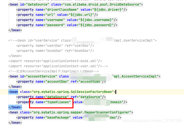 可以看出我在自己项目中使用的是typeAliases 指定别名 但是我的类上并没有加@Alias注解,所以spring容器无法解析,才会报错。