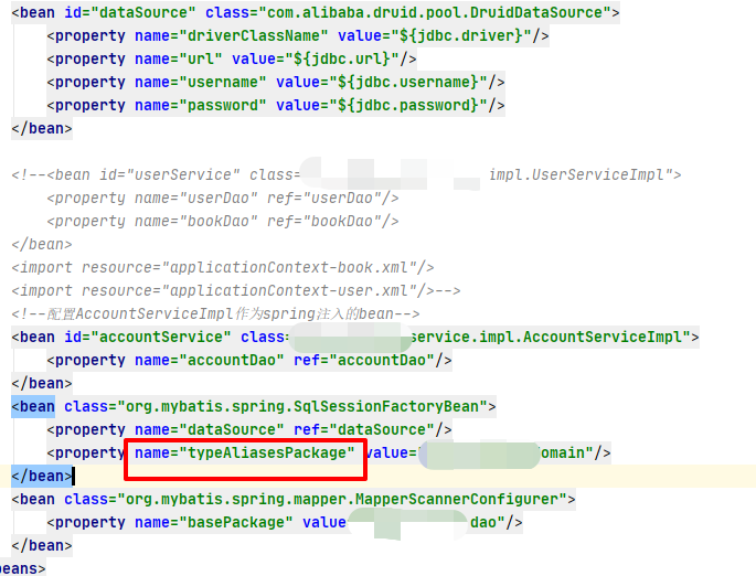 ����: Exception encountered during context initialization - cancelling refresh attempt: org.springframework.beans.factory.BeanCreationException: Error creating bean with name 'accountService' defined in class path resource [applicationContext.xml]: Cannot resolve reference to bean 'accountDao' while setting bean property 'accountDao'; nested exception is org.springframework.beans.factory.UnsatisfiedDependencyException: Error creating bean with name 'accountDao' defined in file [D:\code\springday01\target\classes\com\itheima\dao\AccountDao.class]: Unsatisfied dependency expressed through bean property 'sqlSessionFactory'; nested exception is org.springframework.beans.factory.BeanCreationException: Error creating bean with name 'org.mybatis.spring.SqlSessionFactoryBean#0' defined in class path resource [applicationContext.xml]: Initialization of bean failed; nested exception is org.springframework.beans.TypeMismatchException: Failed to convert property value of type 'java.lang.String' to required type 'java.lang.Class[]' for property 'typeAliases'; nested exception is java.lang.IllegalArgumentException: Could not find class [com.itheima.domain]
