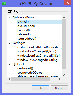 选择信号,我们点击QAbstractButton的clicked()信号,表示按钮被点击: