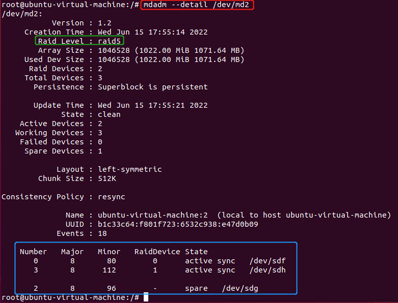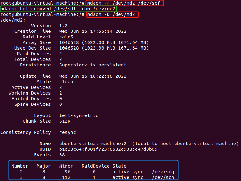 - 不用任何命令sdg硬盘就自动顶替上去了。这时sdf、sdh两个盘组成RAID5