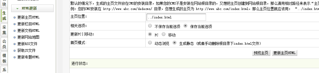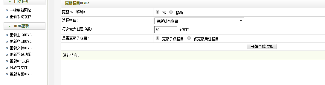 文件覆盖之后后台就变成这样了,生成主页网站文件就会生成index.html文件,生成栏目就会生成栏目对应的文件