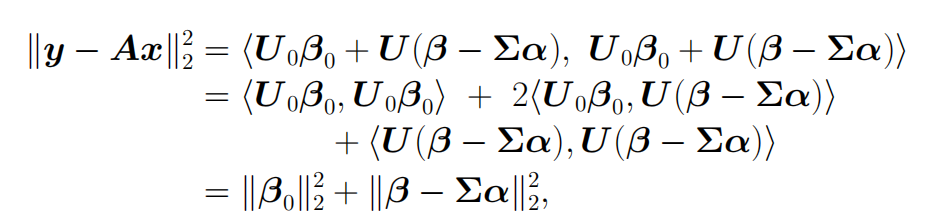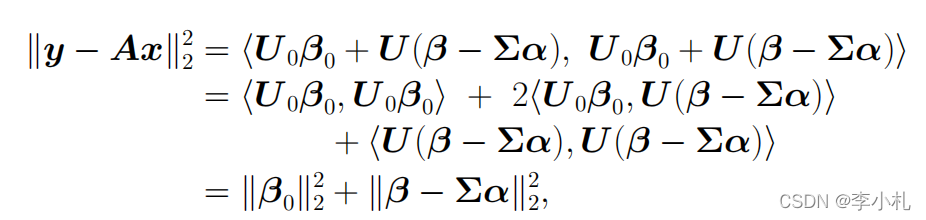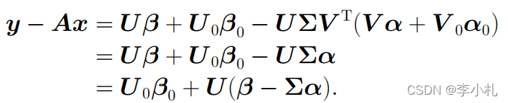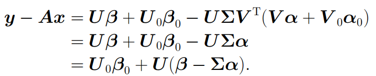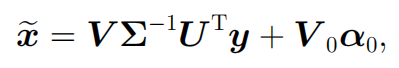 其中前一项为,后一项为v(A零空间中的元素)。而为了保证x的二范数最小,后一项v应为0,所以上述问题的解为