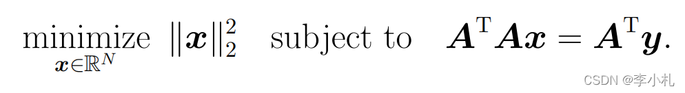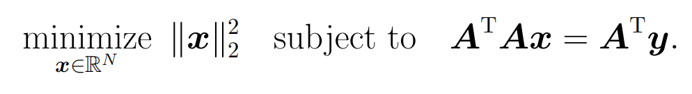 对于上面的问题,当rank(A)<min(M,N)时,该问题存在无穷解,因此我们需要一种约束来挑选无穷个解中的其中一个作为我们的解,其中的一种挑选规则就是我们在所有解中挑选出具有最小二范数的解,建模如下: