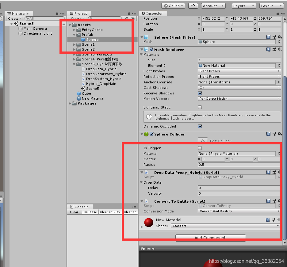 如下图,将球体设置为预制体,将代理脚本挂在到其身上。注意添加ConvertToEntity脚本。