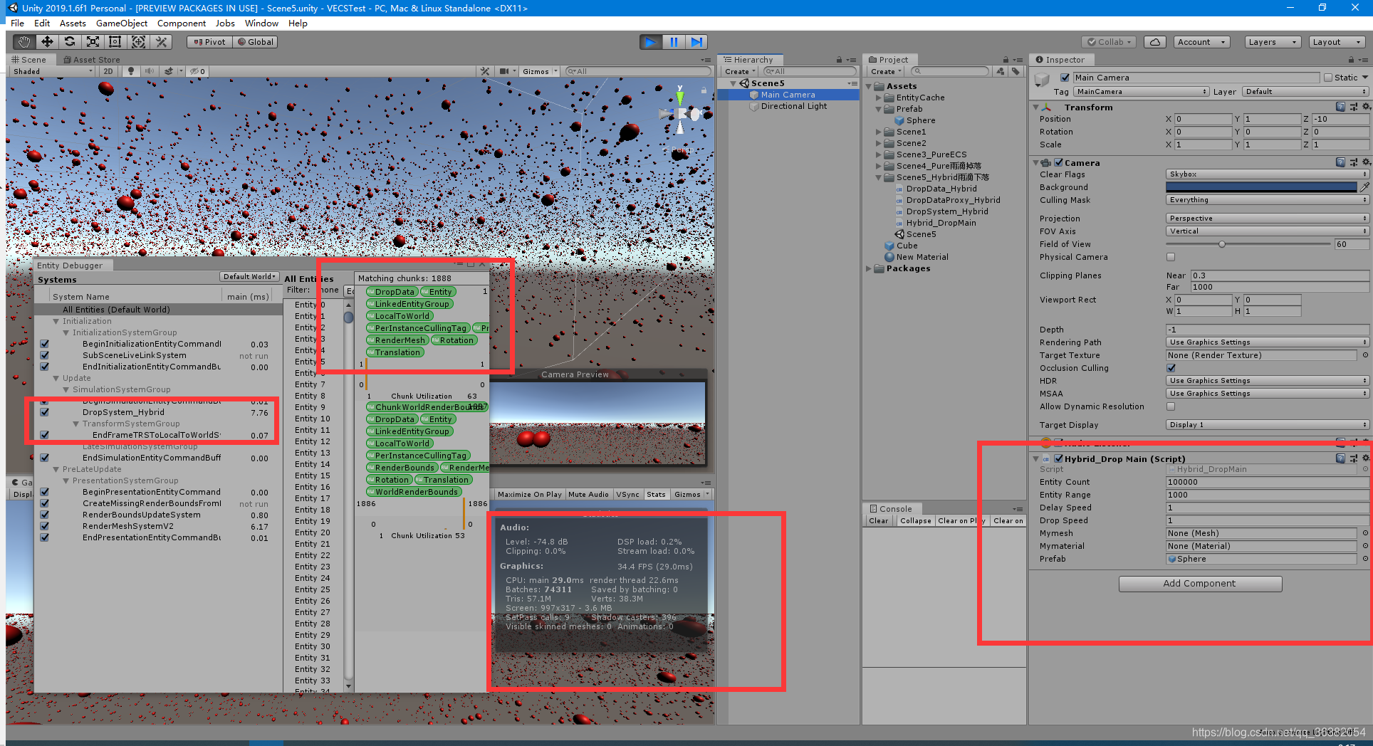 Hybrid编程 GameObject转变为实体,使用unity的预制体来动态创建数量级雨滴下落。在上篇的基础上,将Unity预制体加入代理来实现。