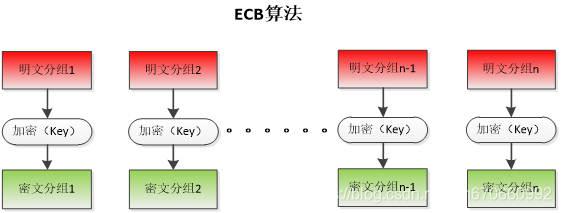 ECB模式是分组密码的一种最基本的工作模式。在该模式下,待处理信息被分为大小合适的分组,然后分别对每一分组独立进行加密或解密处理。如下图所示: