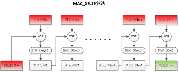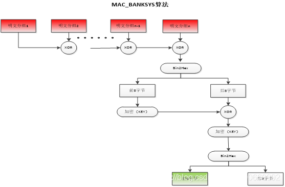 数据分组异或后结果拆分成16字节,取前8字节用密钥加密,结果与后8字节异或,异或后的结果再加密,加密后的结果拆分成16字节,前8字节为MAC结果。