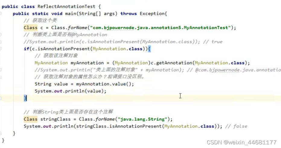 if(c.isAnnotationPresent(MyAnnotation.class)){//是否有Myannotation注解修饰在类上