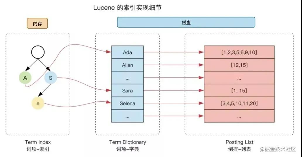 term index:但是问题又来了,你觉得 Term Dictionary 应该放在哪里?肯定是放在内存里面吧?磁盘 io 那么慢。就像 MySQL 索引就是存在内存里面了。