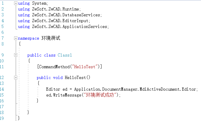 编辑测试代码如下,其作用是当用户在ZWCAD命令行中输入“HelloTest”后,命令窗口显示“环境测试成功”。如果能达到这样的效果,即表明生成的插件能顺利在ZWCAD中加载并使用。