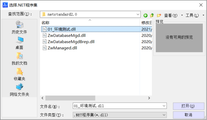 打开ZWCAD,输入NETLOAD加载生成的.dll类库文件