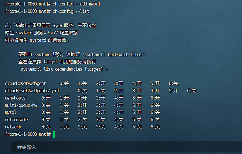如果是 关或者 off 则执行一下:chkconfig --level 345 mysql on