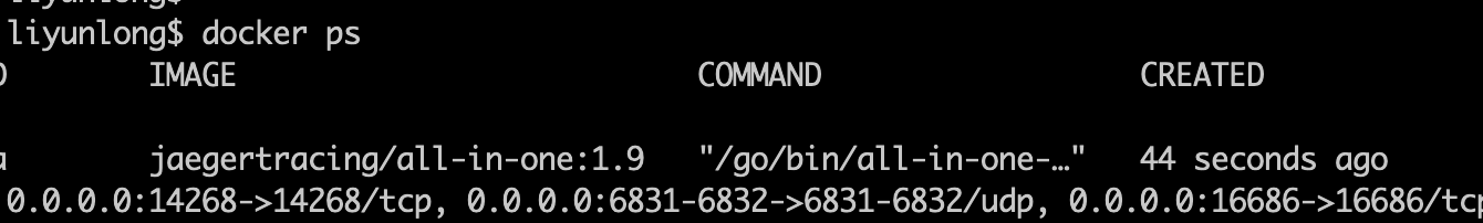jaegertracing/all-in-one:1.9运行ok后我们docker ps看一下是否正常运行: