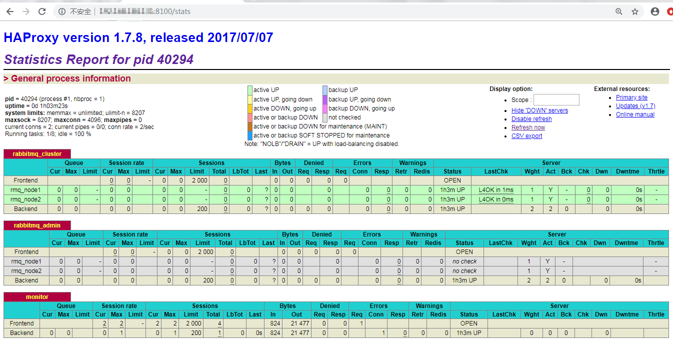 #全局配置 global #日志输出配置,所有日志都记录在本机,通过local0输出 log 127.0.0.1 local0 info #最大连接数 maxconn 4096 #改变当前的工作目录 chroot /usr/local/haproxy-1.7.8 #以指定的UID运行haproxy进程 uid 99 #以指定的GID运行haproxy进程 gid 99 #以守护进程方式运行haproxy #debug #quiet daemon #debug #当前进程pid文件 pidfile /usr/local/haproxy-1.7.8/haproxy.pid #默认配置 defaults #应用全局的日志配置 log global #默认的模式mode{tcp|http|health} #tcp是4层,http是7层,health只返回OK mode tcp #日志类别tcplog option tcplog #不记录健康检查日志信息 option dontlognull #3次失败则认为服务不可用 retries 3 #每个进程可用的最大连接数 maxconn 2000 #连接超时 timeout connect 5s #客户端超时 timeout client 120s #服务端超时 timeout server 120s #绑定配置 listen rabbitmq_cluster bind 0.0.0.0:5671 #配置TCP模式 mode tcp #简单的轮询 负载均衡算法(#banlance roundrobin 轮询,balance source 保存session值,支持static-rr,leastconn,first,uri等参数) balance roundrobin #RabbitMQ集群节点配置 server rmq_node1 192.168.184.129:5672 check inter 5000 rise 2 fall 3 weight 1 server rmq_node2 192.168.184.131:5672 check inter 5000 rise 2 fall 3 weight 1 ###############我把RabbitMQ的管理界面也放在HAProxy后面了################# listen rabbitmq_admin bind 0.0.0.0:8004 server rmq_node1 192.168.184.129:15672 server rmq_node2 192.168.184.131:15672 #haproxy监控页面地址 listen monitor bind 0.0.0.0:8100 mode http option httplog stats enable stats uri /stats stats refresh 5s